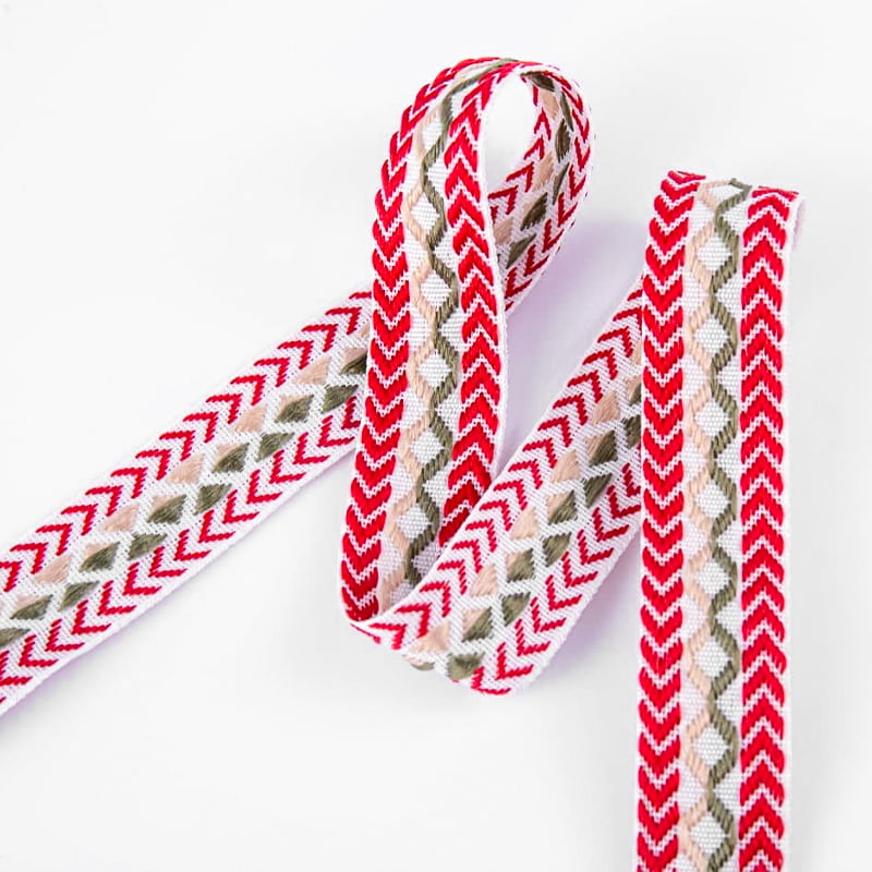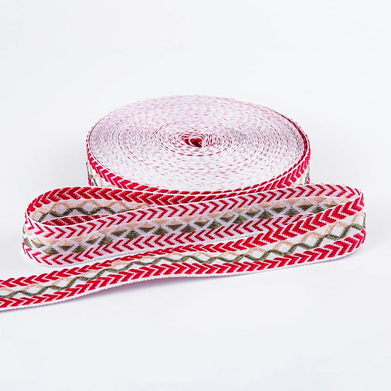 Deze 2,5 cm brede, dubbelzijdige, overlockte jacquardband heeft een dubbelzijdig jacquardpatroon met prachtige patronen aan beide zijden. Het beschikt over uitzonderlijke visuele schoonheid en vakmanschap. Gemaakt van premium mesh-garen en gecombineerd met geavanceerde jacquardtechnologie, combineert het esthetiek met functionaliteit, waardoor het geschikt is voor luxe beddengoed, woondecoratie en op maat gemaakte producten.